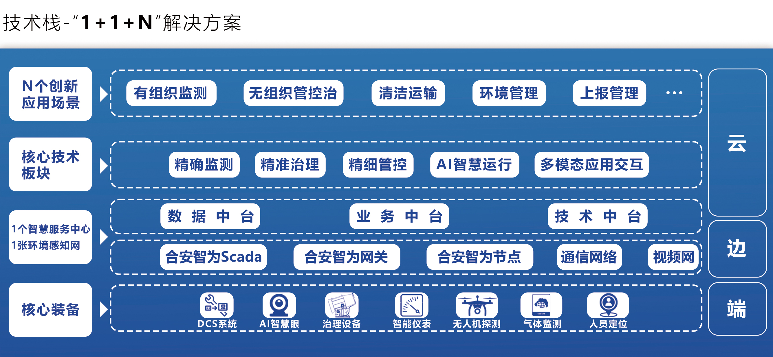- 本方案应用三维GIS、实时三维重构、机器视觉及自然语言交互等技术,依托合安智为自主研发的“1+1+N”的技术栈和安全环保抑尘系列装备、物联网智慧管控系列产品,结合专业化多场景应用系统,构建一个三维智能空间。